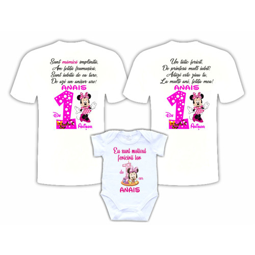 Tricouri - Set 3 buc - Aniversare Fetiţă 1 AN - Tematică Minnie Baby - Mamică împlinită - Tătic fericit